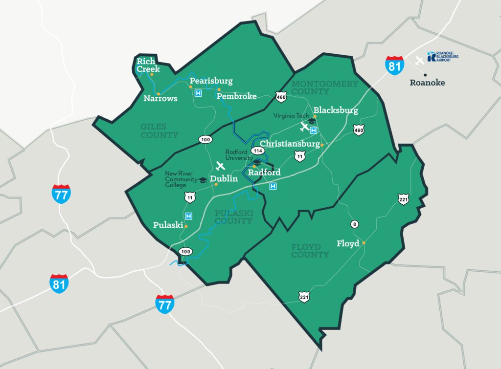 We are made up of welcoming small towns and close-knit communities, each full of opportunity. Spanning 1,458 square miles, the NRV is home to four counties (Floyd, Giles, Montgomery, and Pulaski), one independent city (the City of Radford), and nine close-knit towns (Blacksburg, Christiansburg, Dublin, Floyd, Narrows, Pearisburg, Pembroke, Pulaski, and Rich Creek). It’s a place where friendly neighbors, scenic beauty, and meaningful work come together – so you can truly find your natural fit in our region.