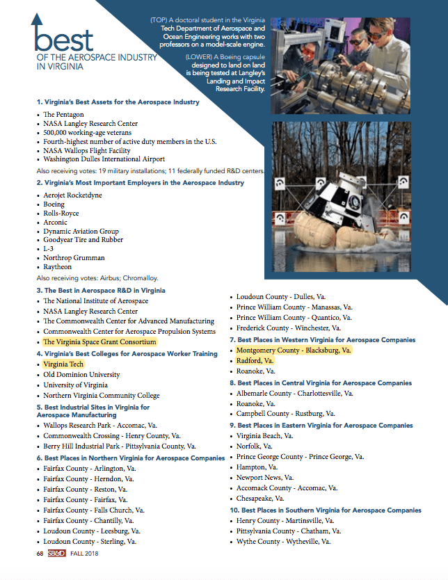 VIRGINIA’S NEW RIVER VALLEY – Several assets and locations in Virginia’s New River Valley have made the cut as some of the best of Virginia’s Aerospace industry. The accolades were published in the Fall 2018 Edition (current issue) of the Southern Business & Development Magazine.